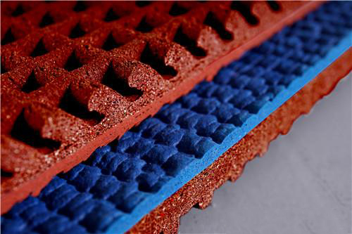 預(yù)制型橡膠跑道系列是一種雙層一體結(jié)構(gòu)的環(huán)保型橡膠卷材,上層為高韌性耐磨面層,面層深度為1-2mm的無規(guī)則花紋是由特制的專業(yè)設(shè)備連續(xù)壓延而成,保證為運動員提供足夠的足底摩擦力。下層為高彈性底層,底層為具有合理傾斜角度的水滴狀蜂巢結(jié)構(gòu)的微孔發(fā)泡層。這種幾何結(jié)構(gòu)能夠很好地配合微孔發(fā)泡的精密配方,能提供卓越的沖擊吸收能力、平滑的能量過渡以及連續(xù)的能量反饋。彈性底層進行惰性氣體閉孔發(fā)泡后,形成的眾多微小的惰性氣體氣囊,保證了底層的高回彈性能。