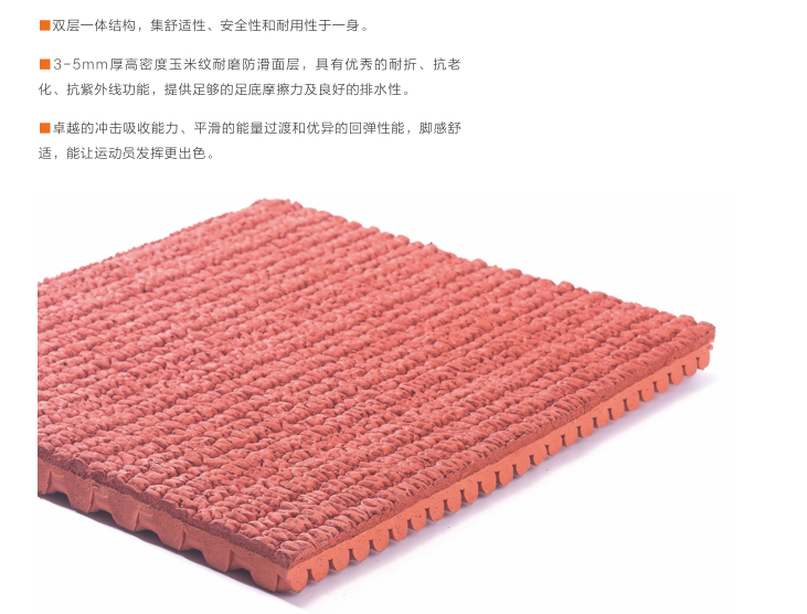 1.面層與底層材質(zhì)相同,采用天然橡膠優(yōu)制而成,綠色環(huán)保;2.高品質(zhì)配合材料純度五星,配比五星,穩(wěn)定性優(yōu)異;