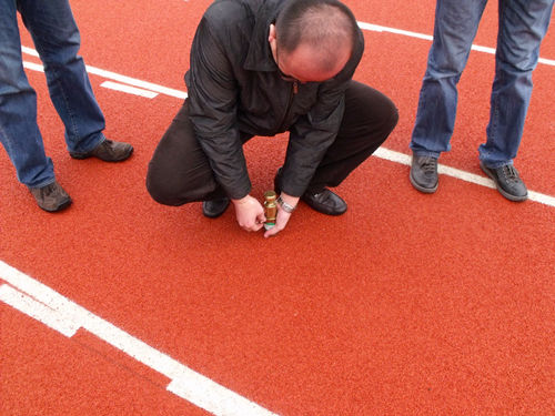 1.確定當日當班工作量,將EPDM粉料(¢0.5以下)、細料(¢0.5-1.5)及面層粘接劑按當班需要的數(shù)量運到作業(yè)面周邊區(qū)域,并確定當日溫度、濕度等氣候條件;
