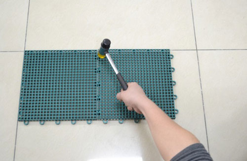 2、依次從左向右,將地板銷和扣對齊,用橡膠錘敲擊固定扣好(如圖所示)。