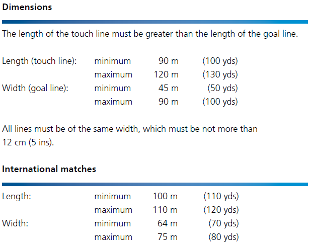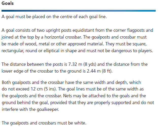 兩根球門柱和橫梁具有不超過12厘米(5英寸)的相同的寬度和厚度。球門線與球門柱和橫梁的寬度是相同的。球門網(wǎng)可以系在球門及球門后面的地上,并要適當(dāng)撐起以不影響守門員。
