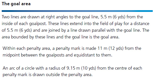從距每個(gè)球門柱內(nèi)側(cè)5.5米(6碼)處,畫兩條垂直于球門線的線。這些線伸向足球比賽場地內(nèi)5.5米(6碼),與一條平行于球門線的線相連接。由這些線和球門線組成的區(qū)域范圍是球門區(qū)。