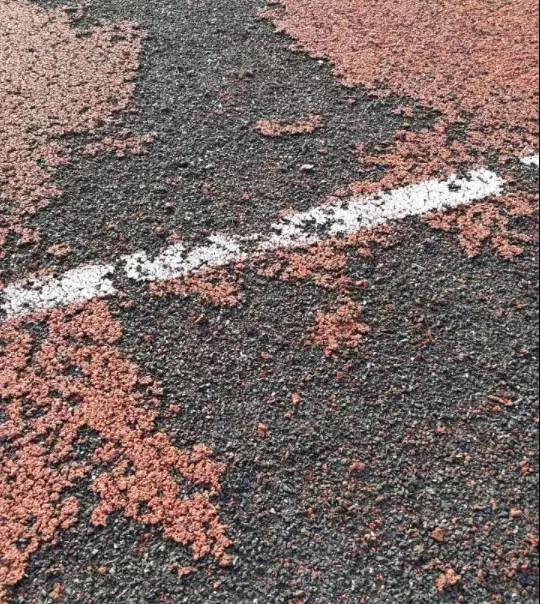 在跑道面層開裂有縫隙的地方,清除所有破損的塑膠層。開裂大的地方,擴大鏟除面積20cm以上;如開裂縫有高低差,則需要擴大鏟除面積至50cm以上。