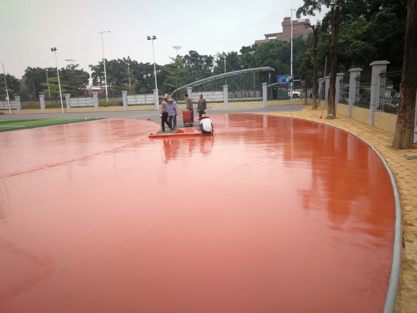 3、用聚氨酯面層綜合漿料與EPDM彩色顆粒進行充分攪拌,用專用高壓噴涂機對塑膠跑道面層均勻地進行噴撒,待面層全部成膠后進行第四步施工